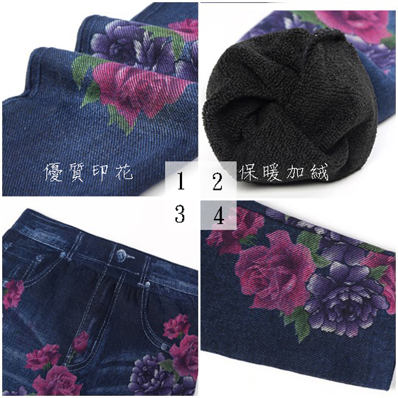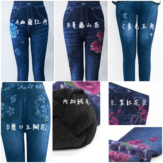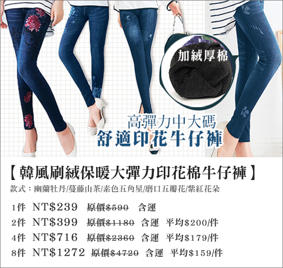 商品簡述: 平均每件最低只要159元起(含運)即可購得韓風刷絨保暖大彈力印花棉牛仔褲1件/2件/4件/8件,款式:幽蘭牡丹/蔓藤山茶/素色五角星/磨口五瓣花/紫紅花朵。